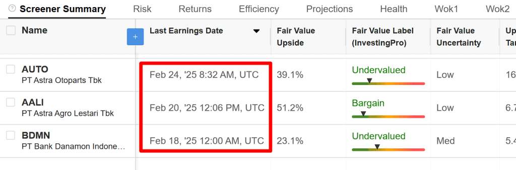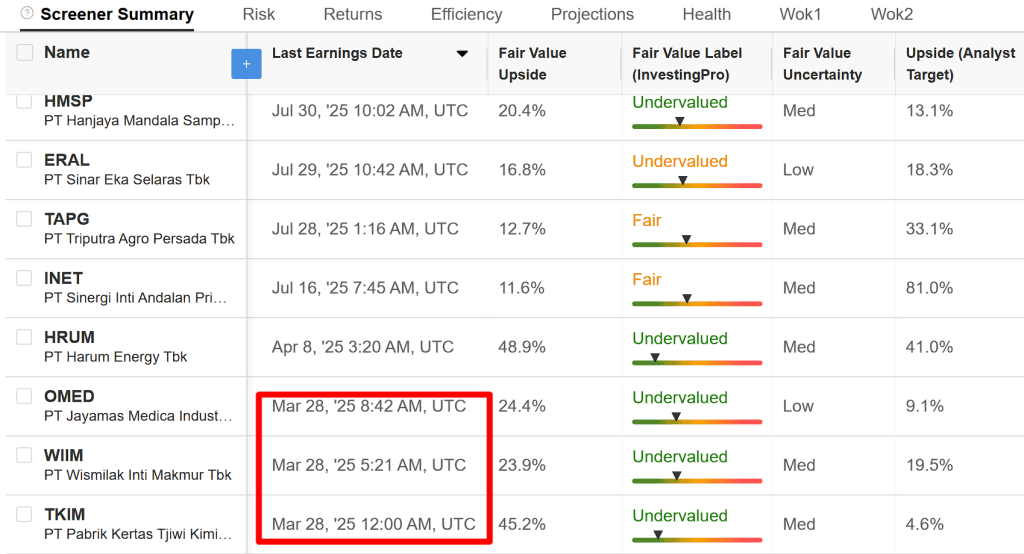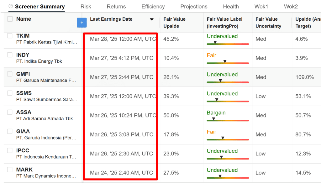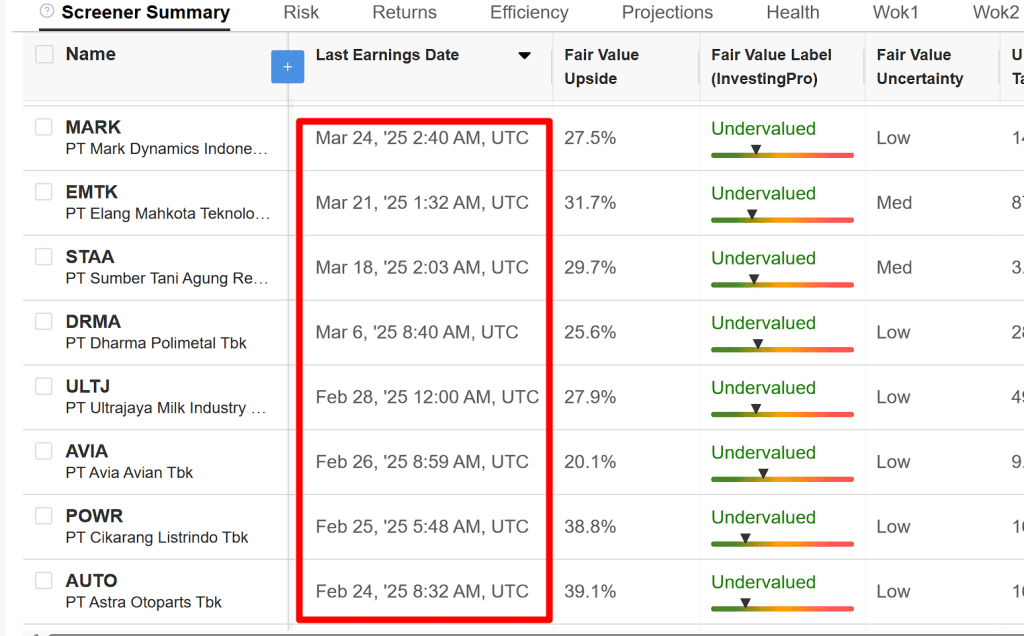 Tanggal 7 Feb 2026, cek di Investing.com mengenai last earning date. Terlihat bahwa banyak perusahaan dengan upside tinggi last earning datenya masih di bulan lalu, di akhir bulan Maret. Jadi banyak yang tidak lapor earning date 3 bulanan, tapi submit tahunan aja.